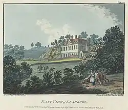 In the late 17th century, the Williams family built a new house nearby, known as New Llangibby Castle,[lower-alpha 3][13] adapted the castle ruins to a landscape garden feature and in around 1707 established an avenue of Scots Pines which ran from the gates of the estate to the River Usk.[14] In the late-19th century, the motte was planted over with conifer trees and rhododendron, having previously been used as a bowling green.[15] These were felled in the early 21st century, as were the softwood trees planted in the central enclosure,[16] while New Llangibby Castle was demolished in 1951.[lower-alpha 4][17][16] The north and south stable ranges, both contemporaneous with the new house, remain and are Grade II listed buildings.[18][19] The site is listed at Grade II on the Cadw/ICOMOS Register of Parks and Gardens of Special Historic Interest in Wales.[20] Tregrug Castle, and the remnants of the original motte-and-bailey fortification, are scheduled monuments.[4][2]