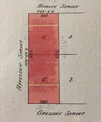 On that same day, William Lemin, subdivided the northern allotment, Allotment 5 of one acre and nineteen perches, bordered by the corner of Havelock and Howitt Streets, into six individual housing blocks for sale.[67] This part of the original "Trelanwy" property had been the orchard.