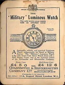 - "A book published during the war as early as 1916 "Knowledge for War: Every officer's handbook for the front" by Captain B. C. Lake of the King's Own Scottish Borderers included the list of Officer's Kit shown in the picture. The first item on the list, ahead of otherwise indispensable items such as "Revolver" and "Field glasses" is "Luminous wristwatch with unbreakable glass". The presence of luminous paint and an unbreakable crystal became the signature features of a trench or "Service" watch, and featured prominently in adverts during the war."[2]