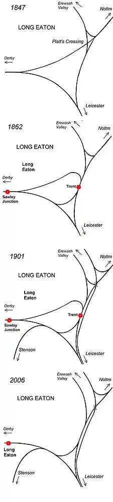 Between 1847 and 1862, the Midland built a line from Chesterfield (now known as the Erewash Valley Line). This had a curve to join the northbound line towards Nottingham, but crossed the Derby-Nottingham curve on the level at Platt's Crossing to meet the southbound line.
