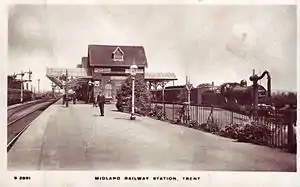 At this time passengers from Nottingham travelled to Derby before heading for London, an 18 miles (29 km) round trip. Trent Station was built in 1862 as an island platform, in typical "Midland Gothic" style, on the Nottingham-Leicester arm. Through its century long existence it barely changed - even retaining the gas lighting.