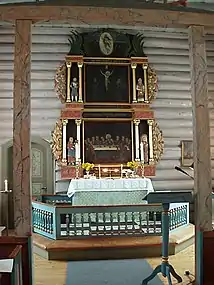 By the 1720s, a new main road was built through the valley, about 1.2 kilometres (0.75 mi) to the southwest of the church, and by this time, the old church was getting to be too small for the parish. It was decided at that time to build a new church on a new site, near the new main road. The lead builder was Jens Skanke, the son-in-law of the local parish priest Christian Wolfgang Monrath. The new church was built in 1727-1728 and it was a wooden cruciform building. Some of the stone from the medieval church was reused in the foundation of this new building. The new church was consecrated on 12 September 1728.[3][4][5]