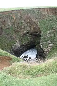 Trevone Bay is a Site of Special Scientific Interest (SSSI). It contains four Geological Conservation Review sites (GCR) and is within the Cornwall Area of Outstanding Natural Beauty (AONB). There are Goniatite fossils on Pentonwarra Point and Conodont fossils on Marble Cliff.[2] The 'Sink Hole', a large blowhole formed by a collapsed sea cave, can be seen on a sloping field above the east side of the bay.[3][4]