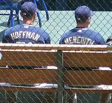 Hoffman was known for his high leg kick, the menacing glare through his cap pulled down almost to his eyes, and his deceptive changeup.[12][21] When Hoffman first came into the league, he could throw up to 95 mph.[12] He would also throw a slider and only an occasional changeup.[144] His original changeup was a conventional circle changeup taught to him by Cincinnati scout Larry Barton.[64] Hoffman learned a different changeup, which he throws with a palmball grip, from teammate Donnie Elliott in 1994.[2][145] He began using the new changeup in 1995 when his fastball had dropped to 88–90 mph after his offseason injury on the beach. With the decrease in velocity, Hoffman knew he could not rely as much on his fastball.[12][146] He played through 1995 and had surgery the following offseason for a torn rotator cuff.[2] When he returned the following year, Hoffman's fastball was at 87–88 mph, but he had more experience with his new changeup. His fastball reached back as high as 91 mph in 1998, but by sometime after 2000 it dropped down to 83–88 mph.[12][146][147] His repertoire by then included primarily of his changeup, a four-seam fastball, a slower cut fastball that moves in towards a left-handed batter, and the occasional slider and a curveball.[144][148]
