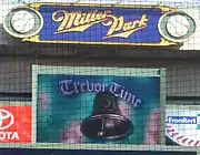 On January 13, 2009, Hoffman signed a one-year, $6 million deal with the Milwaukee Brewers.[107] He suffered a strained muscle on the right side of his rib cage in spring training,[108] and started the season on the DL. He made his Brewers debut on April 27, 2009.[109] Hoffman recorded his first save for Milwaukee the next day, and the Brewers continued with his "Trevor Time" entrance.[110][111] He was named NL Pitcher of the Month as well as Delivery Man of the Month in May after recording 11 saves in 12 scoreless appearances in the month.[112][113] He started the season with 18 scoreless innings before entering in a tie game on June 14 and surrendering a run in a 5–4 loss against the Chicago White Sox.[114]