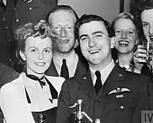 ![]() (Right to left) Pilot Officer Trevor Wade, Flight Lieutenant Robert Holland, Mrs Josephine Wade. September 1941 Biggin Hill | |