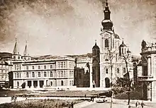 The square was opened in the interwar period on the site of the former tram/train station and customs house (gradski kolodvor). In the 1920s, monuments to the first King of Yugoslavia, Peter I of Serbia, were planned in multiple cities across the kingdom. In Sarajevo, while at first planned in dominant position on the hill of Hrid, the square in front of the Dom Armije was finally chosen for the monument and renamed after King Petar in 1934.[1] Following the demolition of the old train station and customs house, in 1938 a jury including Ivan Meštrović awarded the competition for the monument to the Zagreb sculptor Fran Kršnić. The sections of the equestrian statue were brought to Sarajevo in late 1940 and early 1941. According to some sources, the start of the war thwarted the erection of the monument. [2] However, a photo from the national archives shows the erected statue on its pedestal.[3]