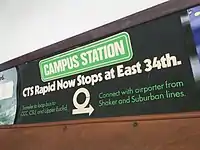 The station opened on July 20, 1930 as "East 34th Street Station" serving only the Shaker Rapid Transit Lines (today's Green and Blue Lines) when the lines were extended using private right-of-way from East 34th Street to the newly opened Cleveland Union Terminal.[5] When the CTS Rapid Transit (today's Red Line) opened in 1955 it used the same tracks but did not stop at East 34th; the station continued to exclusively serve the Shaker Rapid Transit until 1971. A high-level platform was added to the eastern end of the existing low-level platform to serve the CTS Rapid Transit, and this portion of the station opened on March 1, 1971.[6] The CTS station was designated "Campus Station." In 1975, with the formation of RTA both rapid transit lines came under common operation, and free transfers were provided between the lines.