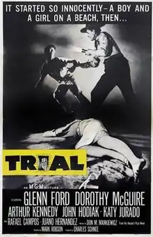 Trial is a 1955 American drama film directed by Mark Robson and starring Glenn Ford, Dorothy McGuire, Arthur Kennedy and Juano Hernandez. Based on the novel written by Don Mankiewicz, it is about a Mexican boy accused of rape and murder; originally victimized by prejudiced accusers, he becomes a pawn of his communist defender, whose propaganda purposes would be best served by a verdict of guilty.