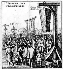 The first to be examined in early September 1618 was Ledenberg. He was hard pressed by his personal enemy the Utrecht fiscal van Leeuwen (according to some with threats of torture, though this was officially denied in a resolution of the States General) and this treatment caused him to commit suicide by slitting his throat with a bread knife on 28 September 1618 (so after two weeks).[43] According to the suicide note in the French language that he left, that was referred to in his verdict, he hoped with this desperate act to halt the trial (a not unreasonable expectation) and thereby to prevent a sentence of forfeiture of his assets.[44] But the judges had his body embalmed and retained it until his "execution" which took place posthumously after his conviction on 15 May 1619[43]