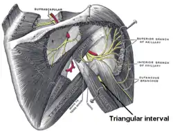 ![]() Suprascapular and axillary nerves of right side, seen from behind. Triangular interval is labeled.) | |