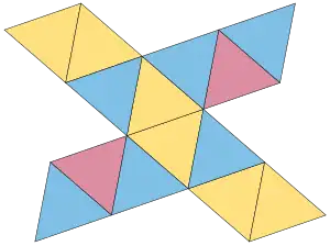 The triaugmented triangular prism can be constructed by attaching equilateral square pyramids to each of the three square faces of a triangular prism, a process called augmentation.[5] These pyramids cover each square, replacing it with four equilateral triangles, so that the resulting polyhedron has 14 equilateral triangles as its faces. A polyhedron with only equilateral triangles as faces is called a deltahedron. There are only eight different convex deltahedra, one of which is the triaugmented triangular prism.[6][7] More generally, the convex polyhedra in which all faces are regular polygons are called the Johnson solids, and every convex deltahedron is a Johnson solid. The triaugmented triangular prism is numbered among the Johnson solids as .[8]