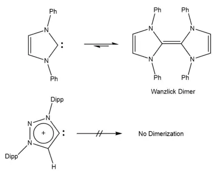 The 1,2,3-triazol-5-ylidene system demonstrates fascinating reactivity, particularly with respect to the typical dimerization pathways for NHC's. Guy Bertrand notes “the Wanzlick equilibrium pathway for classical carbenes is disfavored [for these MIC’s].[20]" The Wanzlick equilibrium describes a typical dimerization for Arduengo type carbenes (NHC’s).[25] Due to their apparent reluctance to participate in this dimerization pathway, carbenes based on the 1,2,3-triazol-5-ylidene system have vastly extended shelf lives.[1] These systems still require significant kinetic stabilization to be stable in solution.[1]