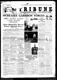 Tribune was the official newspaper of the Communist Party of Australia. It was published by the Central Committee of the Communist Party of Australia from 1939 to 1991. Initially it was subtitled as Tribune: The People's Paper. It was also published as the Qld Guardian, Guardian (Melbourne), Forward (Sydney).[1] It had previously been published as The Australian Communist,[2] (1920-1921) The Communist,[3] (1921-1923) and the Workers' Weekly[4] (1923-1939).