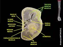The triceps, or triceps brachii (Latin for "three-headed muscle of the arm"), is a large muscle on the back of the upper limb of many vertebrates. It consists of 3 parts: the medial, lateral, and long head.[1] It is the muscle principally responsible for extension of the elbow joint (straightening of the arm).