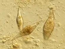 If mammals are infected by cercariae (instead of birds), the parasites die in the skin being entrapped by immune response.[22] The clinical manifestation of such infection is known as a neglected allergic disease called cercarial dermatitis (or swimmer's itch).[2][23] In mice, especially in immunodeficient ones, migration of the parasite to the spinal cord was observed.[24][25]