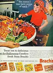 Although some popular histories of Halloween have characterized trick-or-treating as an adult invention to re-channel Halloween activities away from Mischief Night vandalism, there are very few records supporting this. Des Moines, Iowa is the only area known to have a record of trick-or-treating being used to deter crime.[59] Elsewhere, adults, as reported in newspapers from the mid-1930s to the mid-1950s, typically saw it as a form of extortion, with reactions ranging from bemused indulgence to anger.[60] Likewise, as portrayed on radio shows, children would have to explain what trick-or-treating was to puzzled adults, and not the other way around. Sometimes even the children protested: for Halloween 1948, members of the Madison Square Boys Club in New York City carried a parade banner that read "American Boys Don't Beg."[61] The National Confectioners Association reported in 2005 that 80 percent of adults in the United States planned to give out confectionery to trick-or-treaters,[62] and that 93 percent of children, teenagers, and young adults planned to go trick-or-treating or participating in other Halloween activities.[63]