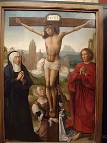 Though in the Middle Ages the crucifixion of Christ typically depicted four nails, beginning in the thirteenth century some Western art began to represent Christ on the cross with his feet placed one over the other and pierced with single nail.[1] The poem Christus patiens attributed to St. Gregory Nazianzus and the writings of Nonnus and Socrates of Constantinople also speak of three nails.[1]