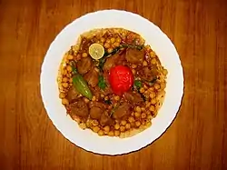 Tharid (Arabic: ثريد, also known as trid, taghrib, tashreeb or thareed) is a bread soup from Arab cuisine found in many Arab countries. Like other bread soups, it a simple meal of broth and bread in this instance crumbled flatbread moistened with broth or stew.[1] Historically, the flatbread used was probably stale and unleavened.[2] As an Arab national dish it is considered strongly evocative of Arab identity during the lifetime of the Islamic prophet Muhammad. According to a widespread legend, this unremarkable and humble dish was the prophet's favorite food.[3]