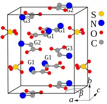 TGS crystals may be formed by evaporation of an aqueous solution of sulfuric acid and a greater than three-fold excess of glycine.[4] They belong to the polar space group P21 and therefore are pyroelectric and ferroelectric at room temperature, exhibiting spontaneous polarization along the b-axis ([010] direction). The Curie temperature of the ferroelectric transition is 49 °C for TGS and 62 °C for DTGS. The crystal structure consists of SO42−, 2(N+H3CH2COOH) (G1 and G2 in the crystal-structure diagram), and +NH3CH2COO− (G3) species held together by hydrogen bonds.[5] These bonds are easily broken by the polar molecules of water, which leads to the hygroscopicity of TGS – its crystals are easily etched by water. Along the b-axis, the G1-SO4 and G2-G3 layers are stacked alternately. The nearest two neighboring layers with identical chemical composition are rotated 180° around the b-axis against each other.[2][6] DTGS and DLATGS materials are derivatives of TGS which have better pyroelectric properties and give less detector noise as can be shown in the following table.