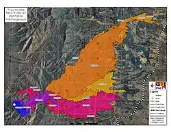 The Trigo Fire was a disastrous[1] wildfire in New Mexico, United States of America that occurred during April and May 2008. It affected the communities of Manzano, Torreon and Tajique, burned 59 homes[2] and over 21 square miles (54 km2). The fire was discovered the morning of 15 April 2008, approximately ten miles east of Belen, and had already burned some 200 acres (0.81 km2) on the western slopes of the Manzano Mountains.[3][4] The fire was 100% contained on 11 May 2008 and the last smoke sighted and extinguished was on 22 May. The US Forest Service said that the fire would not be completely out until snow blanketed the area in December.[5]