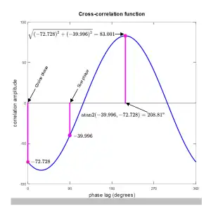 Fig 2. The blue curve is the cross-correlation of a square wave and a cosine function, as the phase lag of the cosine varies over one cycle. The amplitude and phase lag at the maximum value are the polar coordinates of one harmonic in the Fourier series expansion of the square wave. The corresponding rectangular coordinates can be determined by evaluating the cross-correlation at just two phase lags separated by 90º.