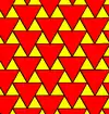 In geometry, the trihexagonal tiling is one of 11 uniform tilings of the Euclidean plane by regular polygons.[1] It consists of equilateral triangles and regular hexagons, arranged so that each hexagon is surrounded by triangles and vice versa. The name derives from the fact that it combines a regular hexagonal tiling and a regular triangular tiling. Two hexagons and two triangles alternate around each vertex, and its edges form an infinite arrangement of lines. Its dual is the rhombille tiling.[2]