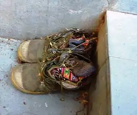 The original temple columns date from the time of King Lalitaditya in the 9th century CE. At the courtyard are large Buddhist prayer wheels and a granite lingam and small Nandi (bull) representing Shiva, while the ancient wooden pagoda-style temple is decorated with Tibetan prayer flags. Both Hindus and Buddhists celebrate the three-day Pauri Festival here in August.[10]