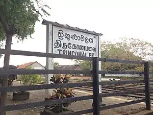 Trincomalee railway station is a railway station in the city of Trincomalee in eastern Sri Lanka. Owned by Sri Lanka Railways, the state-owned railway operator, the station is the eastern terminus of the Trincomalee Line which links Trincomalee District with the capital Colombo.