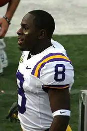 Holliday was a top-ranked American sprinter competing for the LSU Tigers track and field team and is regarded as one of the fastest players in football.[2] He demonstrated his sprinting ability in the 100-meter dash at the 2007 USA Outdoor Track and Field Championships, where he recorded 10.07 seconds in the final – ahead of Walter Dix and second only to Tyson Gay.[5] This qualified him for the 2007 World Championships in Athletics but he opted to not compete, preferring to begin the football season with the LSU Tigers.[6] He continued to race, however, and reached the semi-finals in the 100 m at the 2008 United States Olympic Trials the following year.[7]