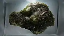 It is usually a light green, although red trinitite was also found in one section of the blast site,[5] and rare pieces of black trinitite also formed.[6] It is mildly radioactive but safe to handle.[7][8][9]