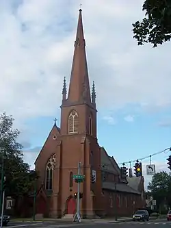 The parish of Trinity Church, Elmira, New York was founded in 1833. Trinity Church is a parish of the Chemung District of the Episcopal Diocese of Central New York, centered in Syracuse, New York. The present structure of Trinity Church is located at 304 North Main Street, Elmira, New York. Designed by architect Henry Dudley, the church was built from 1855 through 1858. It is significant for its Gothic Revival architecture. The church was listed on the National Register of Historic Places in 2007.[2]