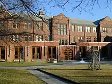 In 1937, construction began on the new St. Hilda's building, located on the east side of Devonshire Place, a short walk from the main Trinity building. Construction was swift, and female students moved in the next year. St. Hilda's Cartwright Hall became the primary stage for dramatics at Trinity for the subsequent four decades.[78] In 1941, the College added an east wing, allowing male students to move out of the temporary accommodations on St. George and onto the College grounds.[79] The same year, the College added a west wing, complete with the Strachan Dining Hall and the Junior Common Room. This substantial expansion was funded by donations from Gerald Larkin of the Salada Tea Company.[80][10] After the War, Larkin also funded the construction of the Trinity College chapel in 1953. Previously, the college had used Seeley Hall over the front entrance - originally intended as the library - as the chapel.[81]