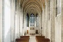 The Trinity College Chapel was built with funds donated by Gerald Larkin, head of the Salada Tea Company from 1922 to 1957. It was designed in the modified perpendicular Gothic style by renowned English architect Giles Gilbert Scott, who was also responsible for the Liverpool Cathedral and the ubiquitous red telephone boxes seen throughout Britain.[105] The chapel extends 100 feet (30 m) to the reredos and is 47 feet (14 m) high at the vault bosses.[99] Using only stone, brick, and cement, Italian stonemasons employed ancient building methods; the only steel in the construction is in the hidden girders supporting the slate roof, with the exterior walls being sandstone. The Chapel contains several architectural sculptures, including a tympanum by Emmanuel Hahn as well as a carved lintel and tympanum by Jacobine Jones, who also carved the wooden angels on the baptistry. The Lady Chapel's altar was preserved from the original Queen Street location chapel, while the matching sedilia was donated by Robertson Davies' widow in his memory.[106] In the chapel a memorial tablet in Indiana limestone designed by Allan George, with lettering and medallions by A. Scott Carter, is dedicated to the members of Trinity College who gave their lives in the First and Second World Wars.[107] A number of bronze memorial plaques also honour alumni who died during the First World War.[108] On the wall outside the entrance to the chapel, a memorial Triptych illuminated manuscript in three frames is an Honour Roll erected by Trinity College in 1942 dedicated to the approximately 1000 men and women of Trinity College who died while serving their country; Canadian artist Jack McNie completed the lettering by hand.[109]