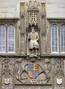 The Great Gate is the main entrance to the college, leading to the Great Court. A statue of the college founder, Henry VIII, stands in a niche above the doorway. In his right hand he holds a chair leg instead of the original sword and myths abound as to how the switch was carried out and by whom. In 1983 Trinity College undergraduate Lance Anisfeld, then vice President of CURLS (Cambridge Union Raving Loony Society) replaced the chair leg with a bicycle pump. Once discovered the following day, the college removed the pump and replaced with another chair leg. The original chair leg was auctioned off by TV Presenter Chris Serle at a Cambridge Union Society charity raffle in 1985. In 1704, the University's first astronomical observatory was built on top of the gatehouse. Beneath the founder's statue are the coats of arms of Edward III, the founder of King's Hall, and those of his five sons who survived to maturity, as well as William of Hatfield, whose shield is blank as he died as an infant, before being granted arms.[26]