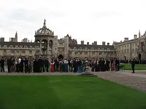 The First and Third Trinity Boat Club May Ball, informally known as Trinity May Ball, is an end-of-year party held annually during the month of June at Trinity College, University of Cambridge. It is notable as the first May Ball ever held in Cambridge. It originates from a celebration of the First and Third Trinity Boat Club, after which the Ball is named, for their win in the 1838 May Bumps: this consisted in a night of heavy drinking at a local pub, the Hoop Inn. Since the bumps were originally held just before the university exams in May, the name still remains traditionally even if the ball has been moved to the subsequent month, on the Monday of May week.[1] The first official May Ball in Trinity College's grounds was actually held in 1866, and the tradition rapidly spread to the other colleges.[2] The event takes place every year since then, but it was cancelled in 1910 due to King Edward VII's death and between 1939 and 1945 during the Second World War.[3] It was also cancelled in 2020 due to the Covid-19 pandemic.