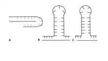 Depending on the sequence of the repeat, at least three intermediates with different secondary structures are known to form.[27] A CGG repeat will form a G-quadruplex due to Hoogsteen base pairing, while a GAA repeat forms a triplex due to negative supercoiling.[25][27] CAG, CTG, and CGG repeats form a hairpin. After the hairpin forms, the primer realigns with the 3' end of the newly synthesized strand and continues the synthesis, leading to triplet repeat expansion.[23] The structure of the hairpin is based on a stem and a loop that contains both Watson-Crick base pairs and mismatched pairs.[25] In CTG and CAG repeats, the number of nucleotides present in the loop depends on if the number of triplet repeats is odd or even.[28] An even number of repeats forms a tetraloop structure, while an odd number leads to the formation of a triloop.[28][29]