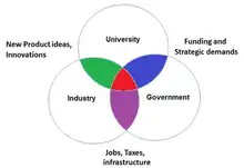 The triple helix model of innovation refers to a set of interactions between academia (the university), industry and government, to foster economic and social development, as described in concepts such as the knowledge economy and knowledge society.[1][2][3] In innovation helical framework theory, each sector is represented by a circle (helix), with overlapping showing interactions. The initial modelling has advanced from two dimensions to show more complex interactions, for example over time. The framework was first theorized by Henry Etzkowitz and Loet Leydesdorff in the 1990s, with the publication of “The Triple Helix, University-Industry-Government Relations: A laboratory for Knowledge-Based Economic Development”.[4] Interactions between universities, industries and governments have given rise to new intermediary institutions, such as technology transfer offices and science parks, and Etzkowitz and Ledersdorff theorized the relationship between the three sectors and explained the emergence of these new hybrid organizations.[5] The triple helix innovation framework has been widely adopted and as applied by policy makers has participated in the transformation of each sector.[6][7][8]