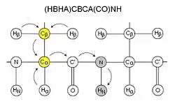 CBCA(CO)NH, or alternatively HN(CO)CACB, correlates the resonances of the amide of a residue with the Cα and Cβ of the preceding residue.[11] Two peaks corresponding to the Cα and Cβ are therefore visible for each residue. This experiment is normally used together with HNCACB. The sidechain carboxamide of glutamines and asparagines also appear in this spectra in this experiment. CBCA(CO)NH is sometimes more precisely called (HBHA)CBCA(CO)NH as it starts with aliphatic protons and ends on an amide proton, and is therefore not an out-and-back experiment like HN(CO)CACB.