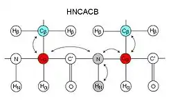HNCACB, or alternatively CBCANH, correlates the chemical shift of amide of a residue the Cα and Cβ of the same residue as well as those of the preceding residue.[12] In each strip, four peaks may be visible – 2 from the same residue and 2 from the preceding residue. Peaks from the preceding residue are usually weaker, and may be identified using CBCA(CO)NH. In this experiment, the Cα and Cβ peaks are in opposite phase, i.e. if Cα appears as a positive peak, then Cβ will be negative, making identification of Cα and Cβ straightforward. The extra information of Cβ from the CBCA(CO)NH/HNCACB set of experiments makes identification of residue type easier than HN(CO)CA/HNCA, however the HNCACB is a less sensitive experiment and may be unsuitable for some proteins.