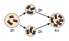 Polyploidy may occur due to abnormal cell division, either during mitosis, or more commonly from the failure of chromosomes to separate during meiosis or from the fertilization of an egg by more than one sperm.[1] In addition, it can be induced in plants and cell cultures by some chemicals: the best known is colchicine, which can result in chromosome doubling, though its use may have other less obvious consequences as well. Oryzalin will also double the existing chromosome content.