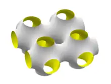 In 1970 Alan Schoen came up with 12 new TPMS based on skeleton graphs spanning crystallographic cells.[11] [12] While Schoen's surfaces became popular in natural science the construction did not lend itself to a mathematical existence proof and remained largely unknown in mathematics, until H. Karcher proved their existence in 1989.[13]