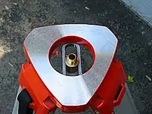 Many modern tripods are constructed of aluminum, though wood is still used for legs. The feet are either aluminum tipped with a steel point or steel. The mounting screw is often brass or brass and plastic. The mounting screw is hollow and has two lateral holes to attach a plumb bob to center the instrument e.g. over a corner or other mark on the ground. After the instrument is centered within a few cm over the mark, the plumb bob is removed and a viewer (using a prism) in the instrument is used to exactly center it.