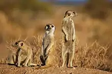 The common dwarf mongoose (Helogale parvula) adopts a tripod stance when being vigilant for predators.[2] In a similar mammal, the thirteen-lined ground squirrel (Spermophilus tridecemlineatus), vigilance behaviour includes four postures: (1) quadrupedal alert (all four feet on the ground with head above the horizontal); (2) semiupright alert (on hind feet with a distinctive slouch); (3) upright alert (on hind feet with back straight and mostly perpendicular to the ground); (4) extended upright alert (similar to upright alert except that the squirrel extends its hind legs,[3] (see image of meerkats). In meerkats (Suricata suricatta), the tripod stance may be adopted relatively briefly during foraging, in which case it is termed guarding behaviour, or for substantially longer periods when the animal is not foraging, in which case it is termed sentinel behaviour.[4]
