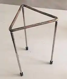 A tripod is a portable three-legged frame or stand, used as a platform for supporting the weight and maintaining the stability of some other object. The three-legged (triangular stance) design provides good stability against gravitational loads as well as horizontal shear forces, and better leverage for resisting tipping over due to lateral forces can be achieved by spreading the legs away from the vertical centre. Variations with one, two, and four legs are termed monopod, bipod, and quadripod (similar to a table).