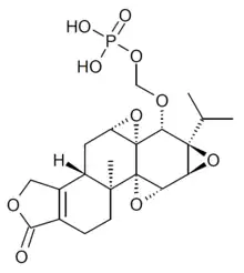 Triptolide is a diterpenoid epoxide which is produced by the thunder god vine, Tripterygium wilfordii. It has in vitro and in vivo activities against mouse models of polycystic kidney disease[2] and pancreatic cancer, but its physical properties[3] and severe toxicity[4] limit its therapeutic potential. Consequently, a synthetic water-soluble prodrug, minnelide, is being studied clinically instead.[3][5]