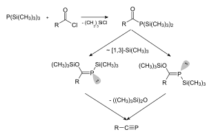 Treatment of certain acyl chlorides with tris(trimethylsilyl)phosphine gives phosphaalkynes, one example being tert-butylphosphaacetylene.[4]