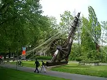A treadwheel crane survives at Harwich, Essex, United Kingdom. It was built in 1667 and formerly stood in the Naval Yard. It was moved to Harwich Green in 1932. The crane has two treadwheels of 16 feet (4.88 m) diameter by 3 feet 10 inches (1.17 m) wide on an axle 13+1⁄2 inches (340 mm) diameter. It is the only double wheel treadwheel crane in the United Kingdom.[24] The crane is a Grade II* listed building.[25]