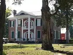 A simple two-story central portico with simple box columns adorns the front elevation and shelters the doors on both levels. The front doorways on the first and second stories both feature sidelights and full fanlights. It is the only brick antebellum house in Wilcox County.[2]