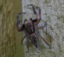 Adults are 8.4mm to 8.8mm in length.[2] The cephalothorax is coloured dark brown and is shaped rectangular and flattened.[3] The abdomen tends to be patterned with grey-brown and orange colours.[3] When fully mature, males have a yellow clypeal band that resembles a mustache.[4] Females do not have this feature.[4] Males also have a slimmer body and longer frontal legs.[4]